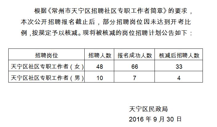 原標(biāo)題:常州市天寧區(qū)2016年招聘社區(qū)專職工作者核減崗位招聘計(jì)劃的公告