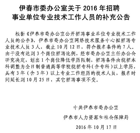 原標題:伊春市委辦公室關于2016年招聘事業(yè)單位專業(yè)技術工作人員的補充公告
