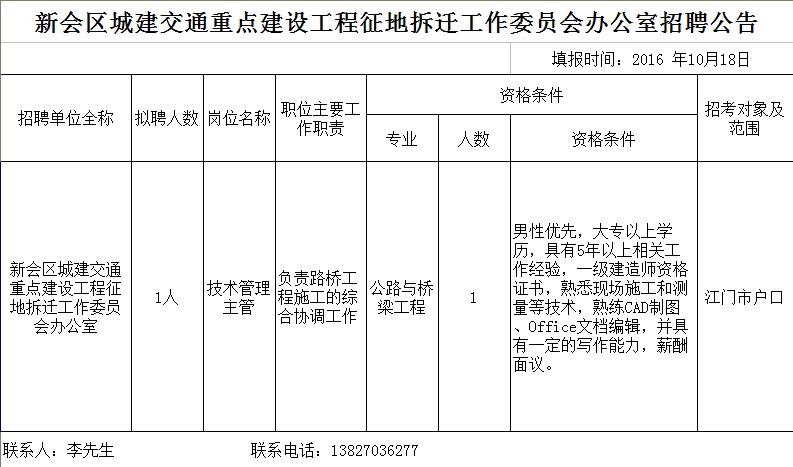 2016廣東江門新會(huì)區(qū)城建交通重點(diǎn)建設(shè)工程征地拆遷工作委員會(huì)辦公室招聘公告【招1人】