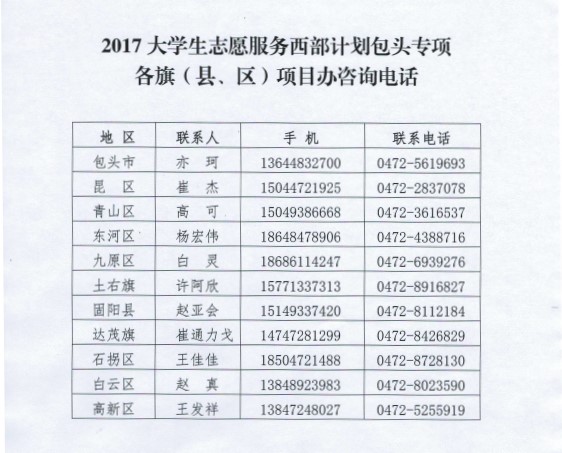 關(guān)于西部計(jì)劃包頭市地方項(xiàng)目報(bào)名,只要符合內(nèi)蒙古大學(xué)生志愿服務(wù)西部計(jì)劃地方項(xiàng)目招募條件(詳見(jiàn)實(shí)施方案預(yù)通知),沒(méi)有在大學(xué)生志愿服務(wù)西部計(jì)劃官方網(wǎng)站上報(bào)名或報(bào)名后未通過(guò)高校審核的,也可直接致電包頭市各旗縣區(qū)項(xiàng)目辦報(bào)名參加考試。