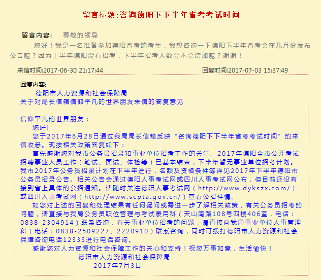 近日,德陽局長信箱回復(fù)德陽考生:下半年暫無事業(yè)單位招考計(jì)劃。我市2017年公務(wù)員招錄計(jì)劃在下半年進(jìn)行。詳情如下: