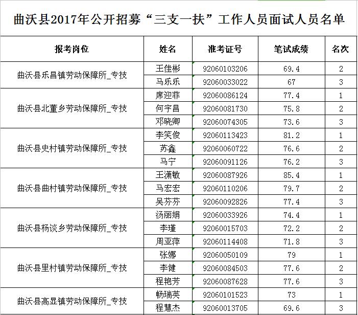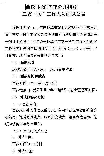 2017山西曲沃縣三支一扶招募面試公告