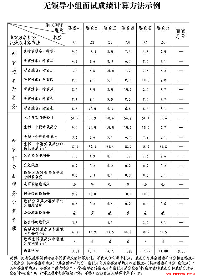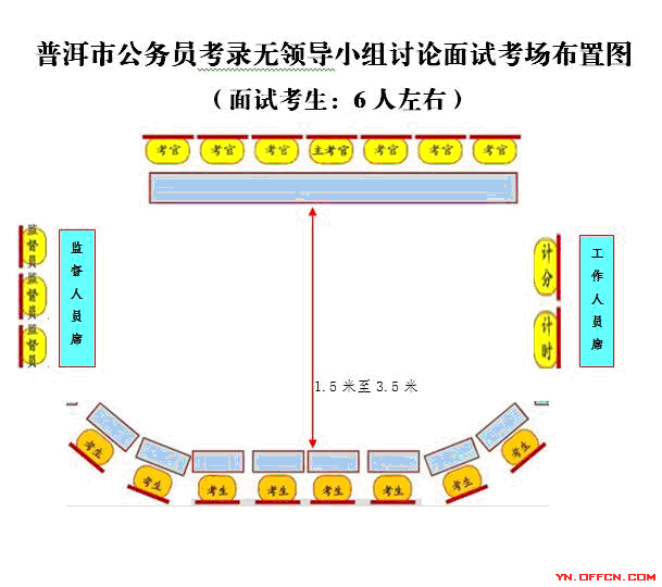 (3)每個面試考場人員安排為考官7人(主考官1人,其他考官6人,面試考場成立面試考官小組,主考官為面試考官小組組長),計分2人,引導(dǎo)員1人,人大監(jiān)督員1人,政協(xié)監(jiān)督員1人,考生一般每個考場每輪8人左右。