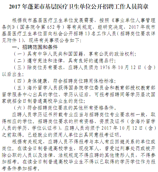 2017山東蓬萊市基層醫(yī)療衛(wèi)生單位招聘13人簡章