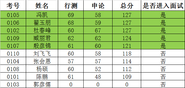 面試采用結構化面試方式進行。面試主要測評考生的言語表達能力、綜合分析能力、專業(yè)素養(yǎng)、個人儀表等。評委打分成績保留到小數點后二位小有數字,且不能為0。面試成績?yōu)?位評委分數的平均分,面試滿分為100分。