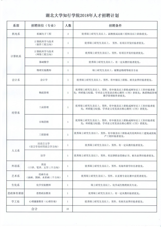 2018年湖北大學(xué)知行學(xué)院招聘公告【招18人】