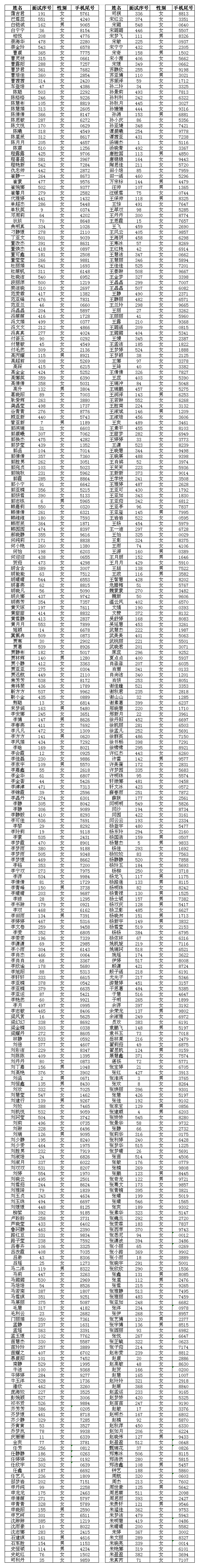 3.面試名單如有重名人員,請大家認真核對手機號碼的后四位,明確自己的面試號碼;