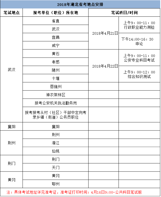 2018年湖北公務(wù)員考試考場分布地點已發(fā)布,據(jù)湖北人事考試網(wǎng)通知:2018年湖北省公務(wù)員考試筆試在武漢市設(shè)置主考區(qū),同時在襄陽市、荊州市、荊門市、黃岡市設(shè)置分考區(qū)。具體在各市參加考試的地區(qū)有哪些,請看下表:
