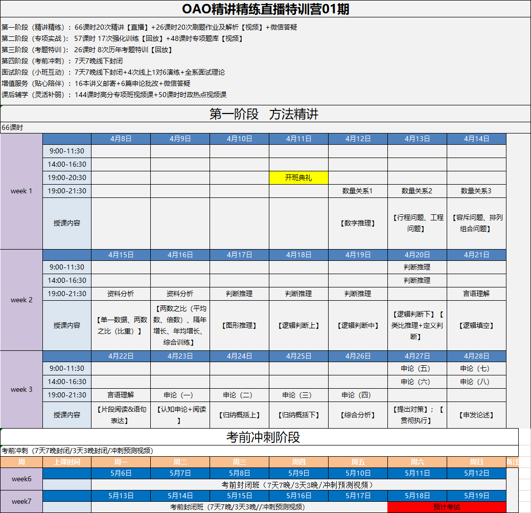 2019年省考小班私教直播特訓營課程安排表