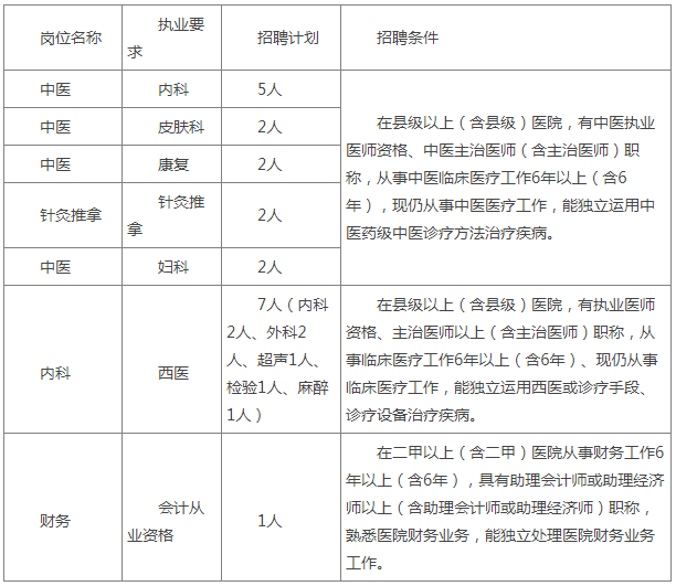 臨滄市中醫(yī)院此次公開選調(diào)事業(yè)編制崗位21名,其中:中醫(yī)崗位13人(內(nèi)科5人、皮膚科2人、婦科2人、康復(fù)2人、針灸推拿崗位2人)、西醫(yī)崗位7人(麻醉1人、內(nèi)科2人、外科2人、超聲1人、檢驗(yàn)1人)、財(cái)務(wù)崗位1人。