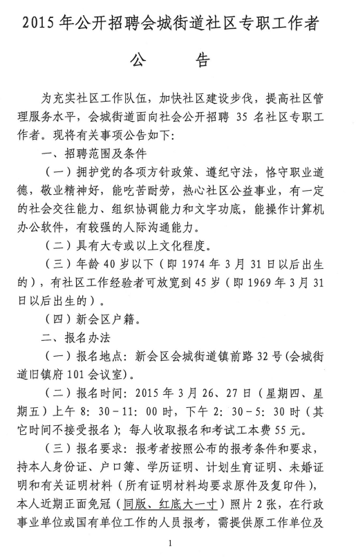2015年廣東省江門新會(huì)區(qū)會(huì)城街道社區(qū)工作者招聘35人公告