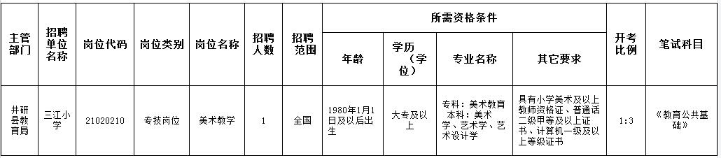 井研縣三江小學(崗位代碼:21020210)原公告“崗位名稱”一欄為“語文教學”更改為“美術教學”,原公告“其他要求”一欄為“具有小學語文及以上教師資格證、普通話二級甲等及以上證書、計算機一級及以上等級證書”更改為“具有小學美術及以上教師資格證、普通話二級甲等及以上證書、計算機一級及以上等級證書”,修訂后崗位條件和要求如下: