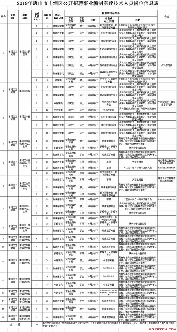 本次公開(kāi)招聘事業(yè)編制醫(yī)療技術(shù)人員63名,具體崗位、人數(shù)及條件要求詳見(jiàn)《唐山市豐潤(rùn)區(qū)2019年公開(kāi)招聘事業(yè)編制醫(yī)療技術(shù)人員崗位信息表》。招聘采取統(tǒng)一招聘方式。筆試、面試考務(wù)工作,由豐潤(rùn)區(qū)公開(kāi)招聘事業(yè)單位工作人員領(lǐng)導(dǎo)小組辦公室委托第三方考試機(jī)構(gòu)組織實(shí)施。