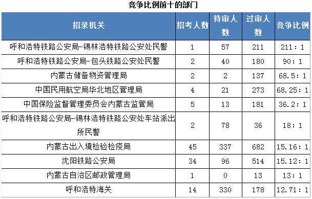 競爭比例的部門為呼和浩特鐵路公安局-錫林浩特鐵路公安處民警,招錄1人,截至到2017年11月2日16時,過審人數(shù)為211人,其次是包頭鐵庫公安處民警,招錄2人,過審人數(shù)為180人。