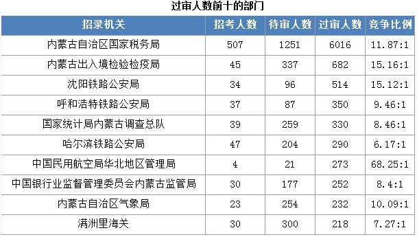 截止到2日16時,通過審核人數(shù)前三位的部門依次是:內(nèi)蒙古自治區(qū)國家稅務局(過審6016人)、內(nèi)蒙古出入境檢驗檢疫局(過審682人)、沈陽鐵路公安局(過審514人),三部門通過審核總人數(shù)達7212人,占通過審核總人數(shù)的70.3%。