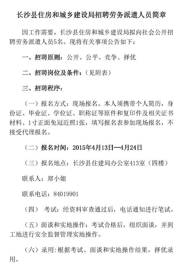 2015年湖南省長沙縣住房和城鄉(xiāng)建設(shè)局招聘勞務(wù)派遣人員公告【招5名】