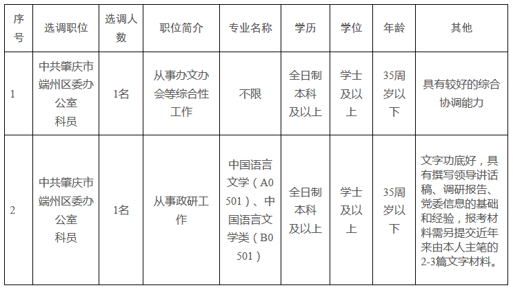 根據(jù)工作需要,中共肇慶市端州區(qū)委辦公室公開(kāi)選調(diào)公務(wù)員2名。現(xiàn)將有關(guān)事項(xiàng)公告如下: