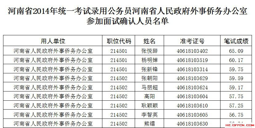 根據(jù)省委組織部、省人力資源和社會廳、省公務員局2014年統(tǒng)一考試錄用公務員工作有關規(guī)定,現(xiàn)將河南省人民政府外事僑務辦公室面試資格確認有關事宜通知如下: