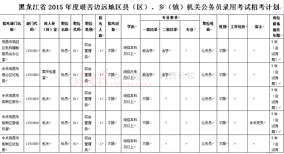 2015年黑龍江省艱苦邊遠(yuǎn)地區(qū)公務(wù)員考試招錄雞西地區(qū)職位表