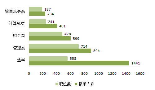 本次考試公檢法系統(tǒng)占據(jù)了“半壁江山”,該系統(tǒng)均為從事法律實務(wù)的工作者,因此,法律類相關(guān)人才就成為本次考試的主體,可謂是一場法學(xué)類專業(yè)的“盛宴”。法學(xué)類專業(yè)以1441人、553個職位于其他專業(yè)。除了法學(xué)類專業(yè),管理類、財會類等專業(yè)的招錄實力也比較可觀。