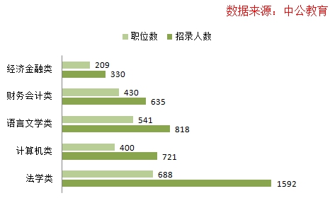 本次考試招錄囊括了理工科、文史類、藝術(shù)等各種專業(yè),涵蓋面廣,其中法學(xué)類、計(jì)算機(jī)類、語言文學(xué)類、財(cái)務(wù)會計(jì)類以及經(jīng)濟(jì)金融類專業(yè)最為“”,有688個職位需要法律類人才,總?cè)藬?shù)高達(dá)1592人,熱度之高令其他專業(yè)難以匹敵。
