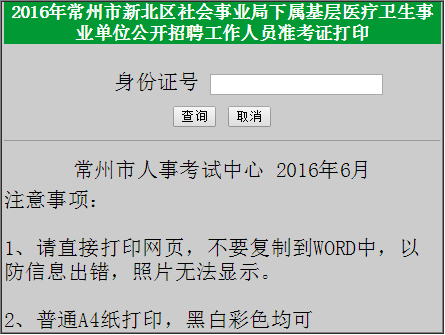 點(diǎn)擊進(jìn)入>>>2016江蘇常州市新北區(qū)社會(huì)事業(yè)局下屬基層醫(yī)療衛(wèi)生事業(yè)單位招聘準(zhǔn)考證打印入口