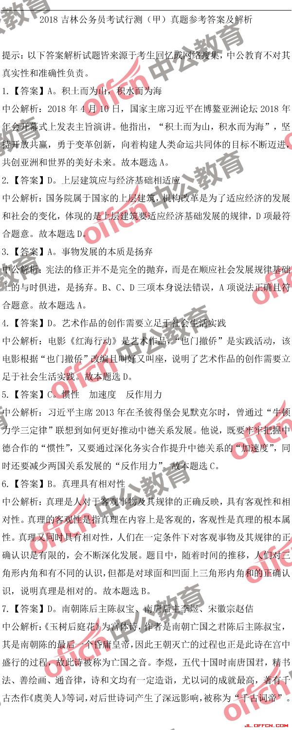 2018吉林公務(wù)員考試行測(cè)(甲)歷年參考答案及解析