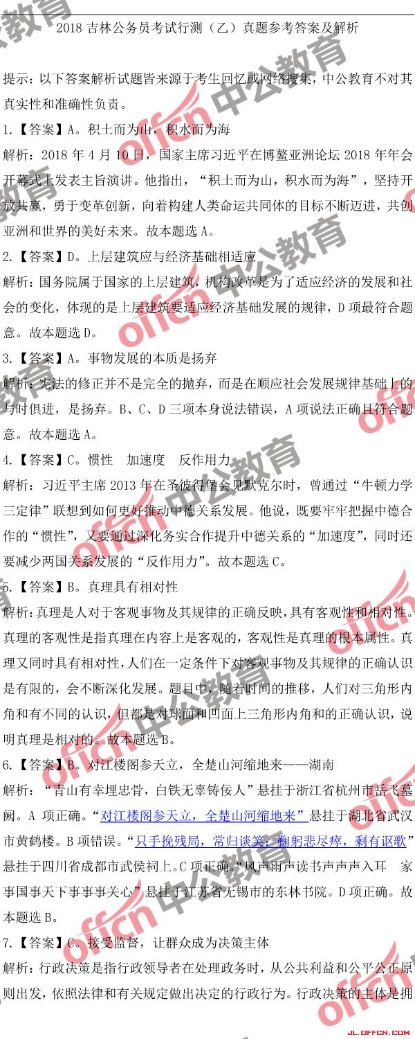 2018吉林公務(wù)員考試行測(cè)(乙)歷年參考答案及解析
