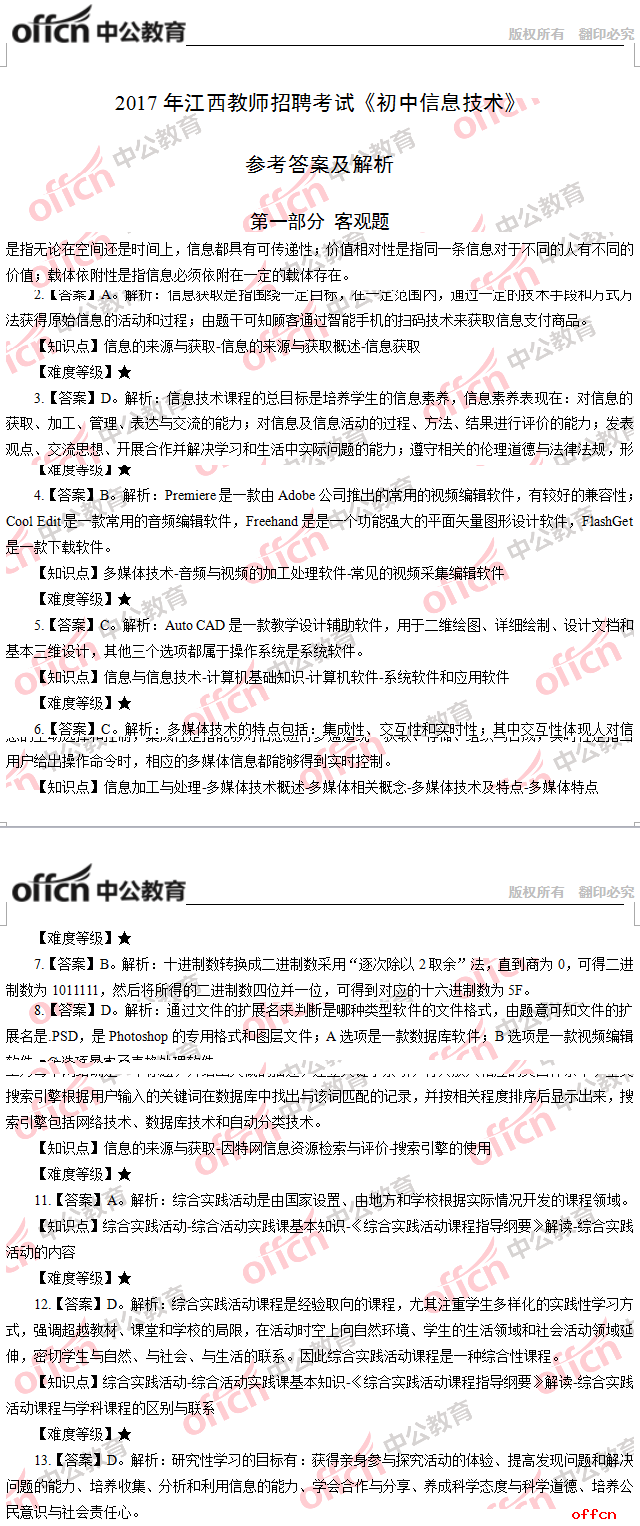 2017年江西教師招聘《初中信息技術(shù)》答案及解析
