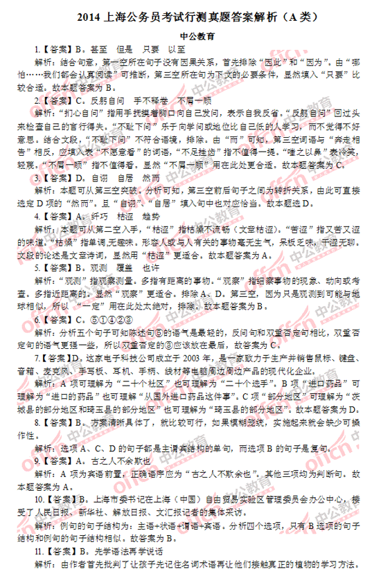2014上海市公務(wù)員考試行測答案解析(A類)