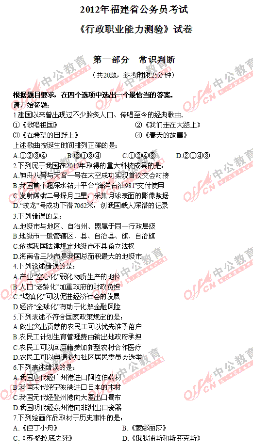 2012年福建秋季省考行測(cè)